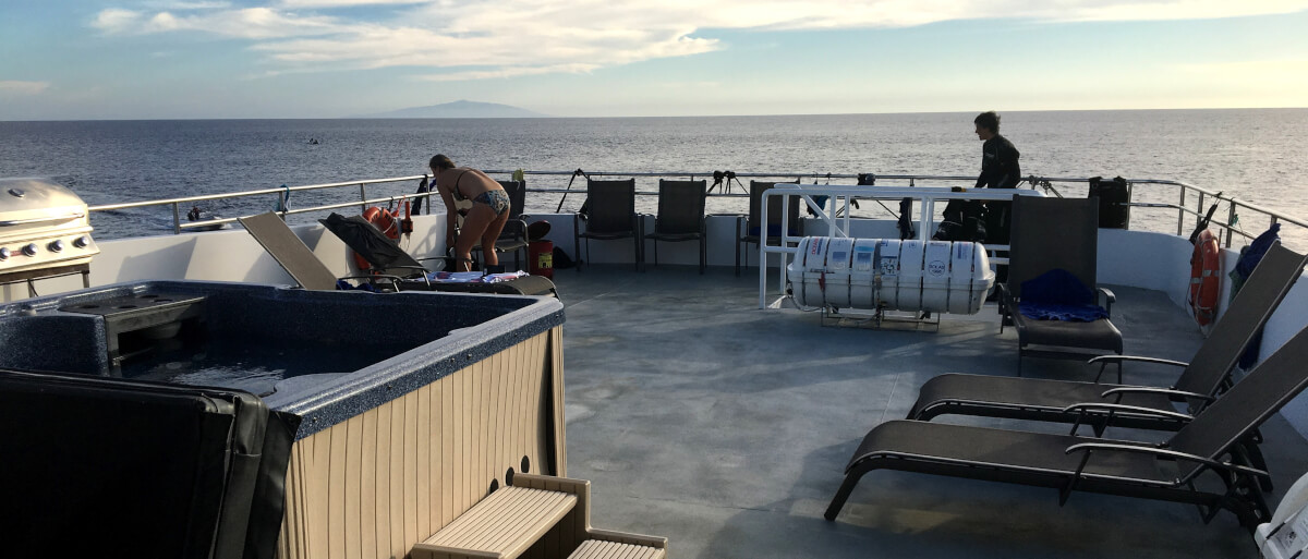 Auf dem Sonnendeck ist ein Süßwasser Whirlpool, den man besonders gerne nutzt, wenn man verfroren nach dem letzten Tauchgang an Bord geht! Liegestühle und eine Bar machen das Sonnendeck zu einem gemütlichen Platz zum Ausruhen. Hier befindet sich auch der Raucherplatz, den doch einige genützt haben, einschließlich mir.