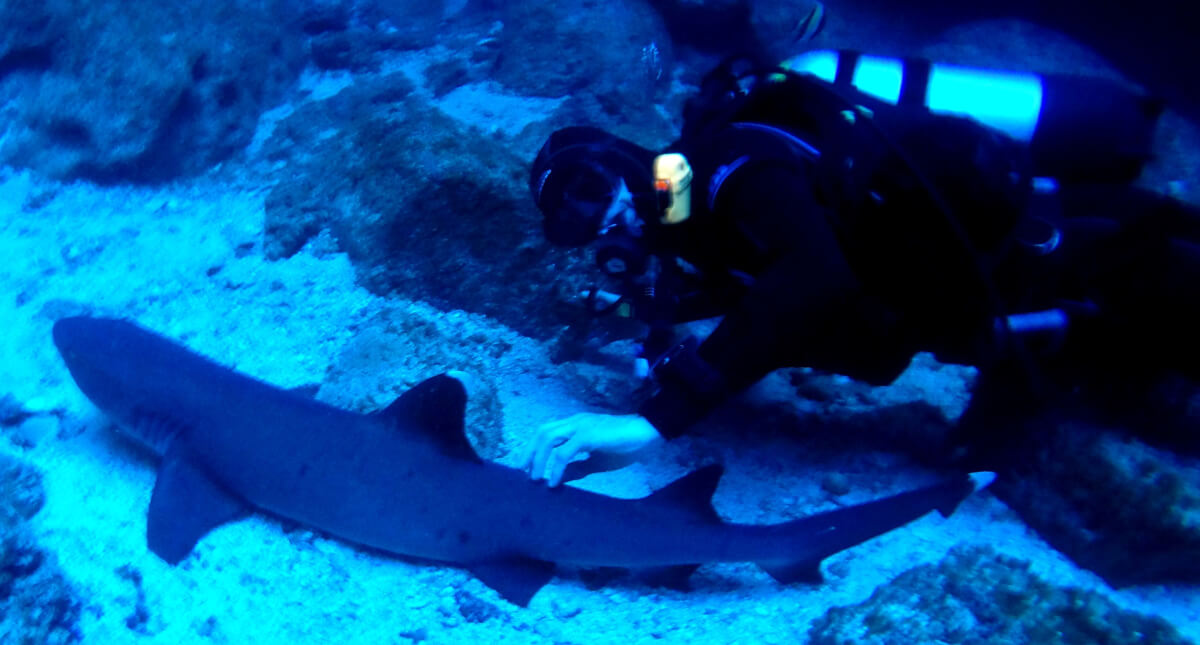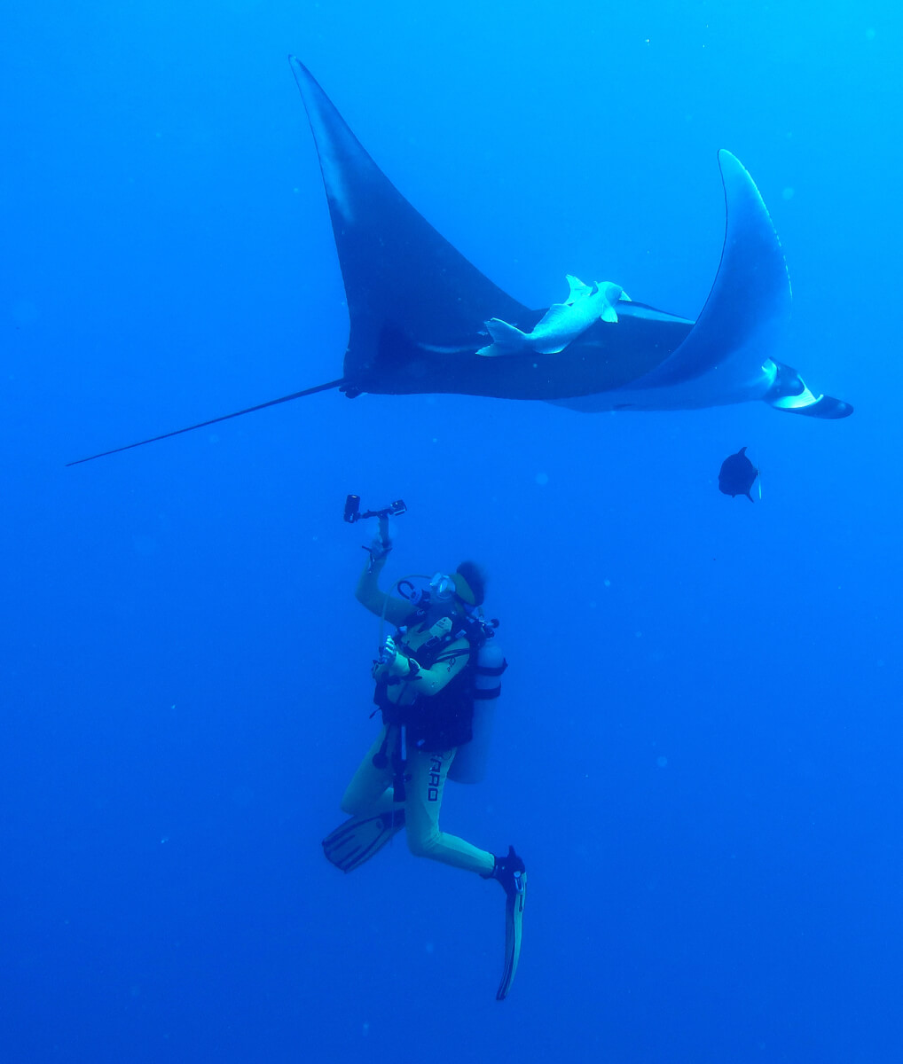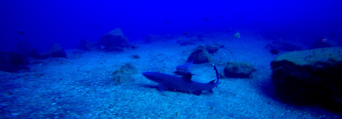 Mantas, Flunder, Langusten, frei schwimmender Oktopus. Abends schnorcheln mit den Seidenhaien. Es hat mich einer attackiert (vielleicht wegen des Lichtes) und in die Kamera gebissen! Ich habe mich ziemlich erschrocken.