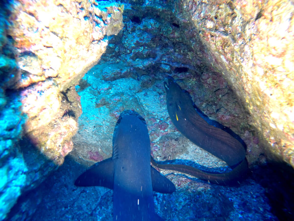 Schlechte Sicht, Riffhaie und Muräne. 2. TG Whale-watchen – keine Wale aber schnorcheln mit Delfinen – super!