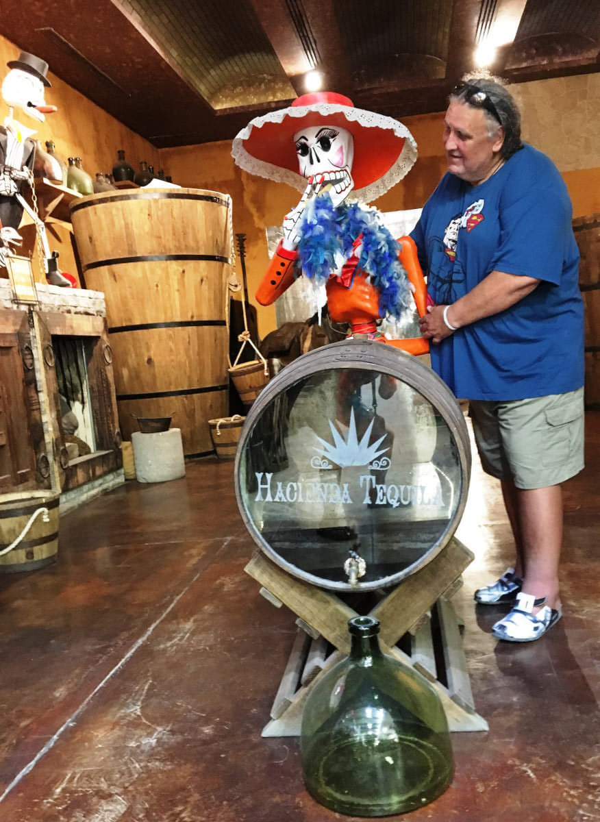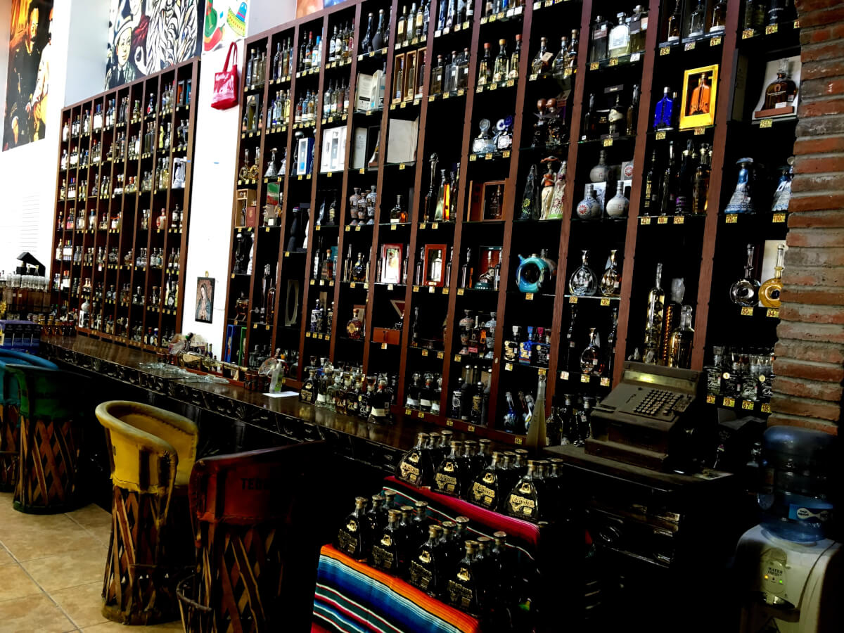 Die Agave wird vielfältig genutzt, der süße Saft wird zum Süßen verwendet, fermentiert war er ein Rauschgetränk, mit teilweise rituellem Charakter. Heute wird er destilliert und als Mezcal (die Raupe in der Flasche ist nur ein Touristen-Gag) verkauft. Früher war die Raupe ein Zeichen für einen guten Mezcal, denn wenn sie ganz blieb und nicht zersetzt wurde, war das guter Stoff. Nicht vergessen darf man natürlich Tequila, das seit 1911 zum Nationalgetränk erklärt worden ist. Tequila ist eine Form der Spirituose Mezcal und wird in der Umgebung der Stadt Tequila im Staat Jalisco und 4 weiteren Staaten aus dem Herzen der blauen Agave in Mexico erzeugt. Es dauert durchschnittlich 6-8 Jahre, bis die Agave geerntet werden kann. Es gibt über 900 Tequila-Arten. Die USA sind mit 46% die größten Abnehmer. Tequila ist auch Basis für bekannte Cocktails, wie Tequila Sunrise oder Margarita. Wir haben einen Tequila Shop mit einem kleinen Museum besucht.