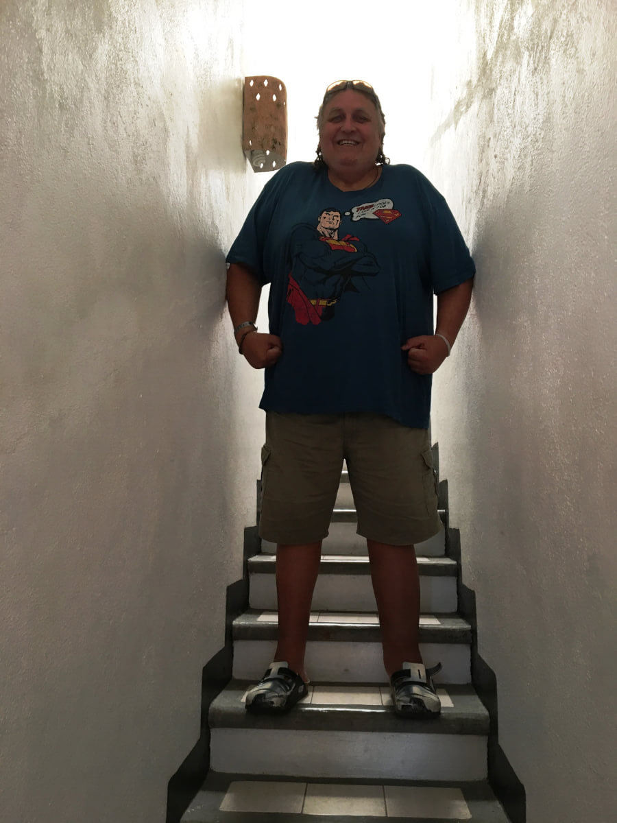 Wir kommen zu einer Figur, die sieht aus wie der „Sandmann“. Ein Tisch und 2 Sessel, ein Mann, ein Becher und eine Flasche, alles mit Sand gestrahlt. Ich gehe nichts ahnend zum freien Sessel, weil ich der Meinung war, das sei ebenfalls eine Statue, und will mich hinsetzten, Auf einmal bewegt sich die Figur, und dreht sich zu mir!