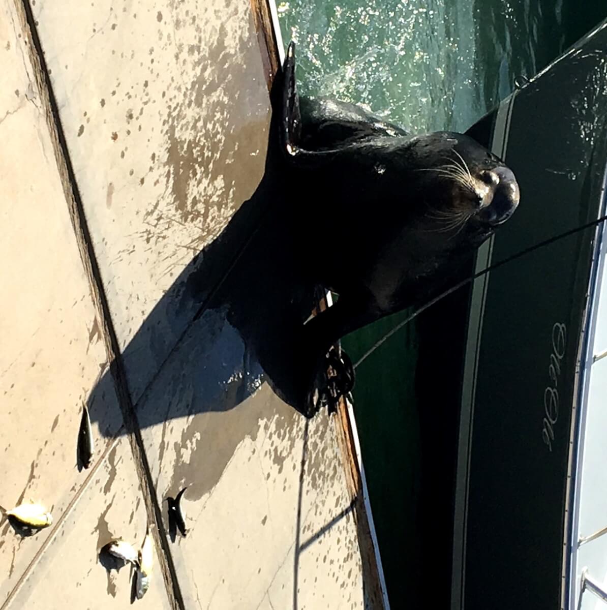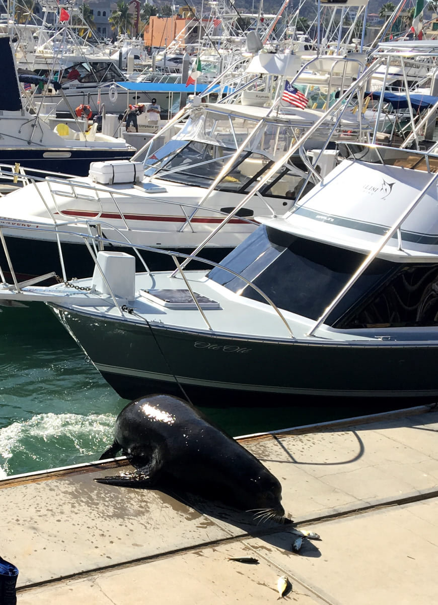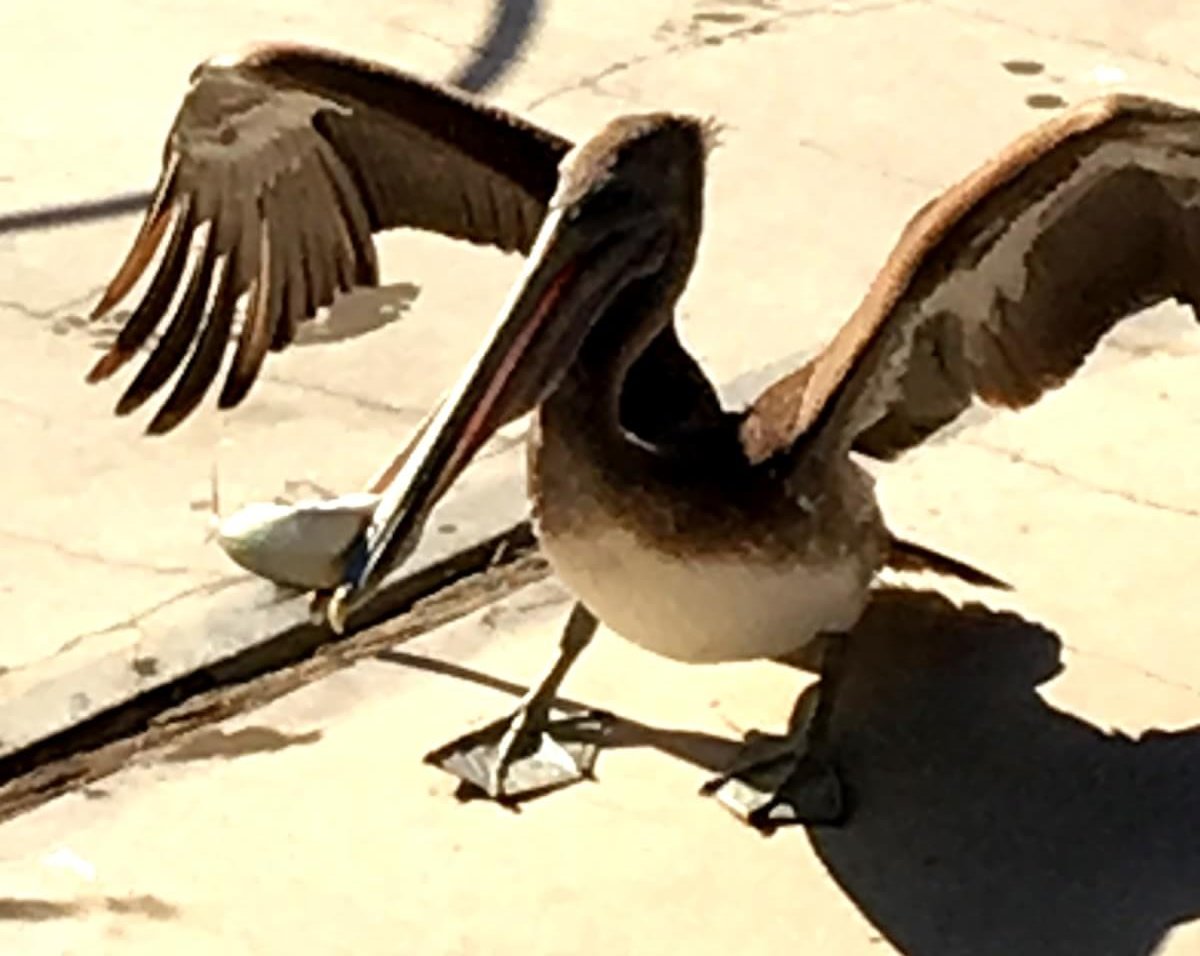 Wir gehen zu Fuß zum Party Strand, das ist eine ganz schöne Wanderung! Unterwegs gibt es so manche Figuren, mit denen wir auch Fotos gemacht haben, Im Hafen tummeln auch Seelöwen und auch die Pelikane erhoffen sich einen Happen von den Anglern zu ergattern. Es ist gerade ein Anglerboot zurückgekommen, die einen riesigen Wahoo gefangen haben.