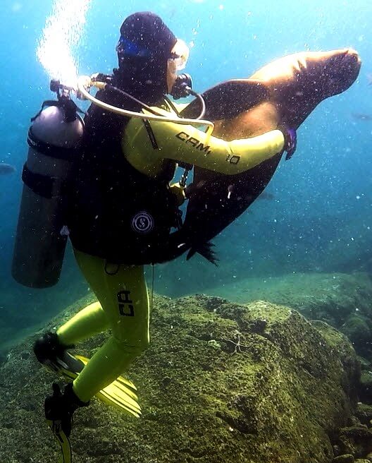 Auf ca. 15 m sehen wir schon die ersten jungen Seelöwen, die neugierig näher kommen und sofort mit unserem Guide (der übrigens selbst fast wie ein Seelöwe schwimmt und ein echt cooler Typ ist) spielen. Auf einmal zupft mich was am Ärmel und da war schon ein Seelöwe bei mir. Die sind so verspielt, es ist eine wahre Freude mit ihnen in Kontakt zu kommen und Action zu haben. Es gibt dort einen Arch, wo ziemlich viele Fische sind, und natürlich auch die Seelöwen Babies. Die großen wachen von oben über ihre Jungen.