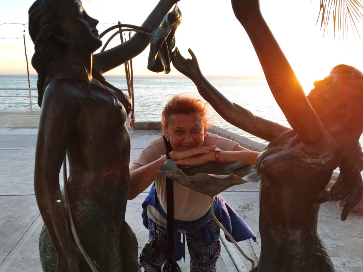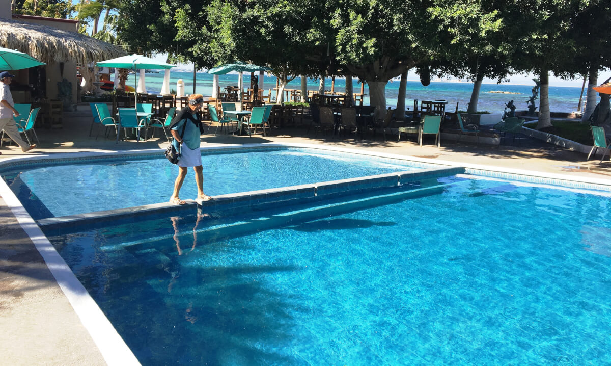 Wir fahren mit dem Mietauto, mit Hilfe von Google Maps und Karten kommen wir ziemlich zielgerade im Hotel La Concha Beach Club in Carretera a Pichilingue in der Nähe von La Paz an. Wir haben ein Double King Sea View Room mit kleinem Balkon. Das Hotel hatte natürlich einen Swimming-Pool und eine Pool Bar, das wir nach dem Tauchen gerne genutzt haben. In der Anlage waren verschiedenste Metall-Statuen, von Meerjungfrauen bis Delfin Skulpturen. Das ladet natürlich zum Fotoshooting ein. ;-)