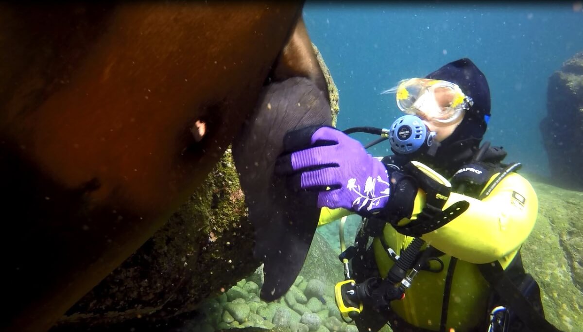 Es hat eine Stelle gegeben, da war eine Nische im Felsen. Der erste Akt der Sea Lions war in diese Nische zu schlüpfen, ein bisschen zu verweilen um dann zu uns zu kommen und an unseren Fingern zu saugen, oder an der Kopfhaube zu zupfen, oder einfach gestreichelt zu werden. Ein junger Seelöwe hat immer versucht mir die Handschuhe auszuziehen. Aber sie sind überhaupt nicht grob, beißen überhaupt nicht fest und wenn man das nicht will, einfach Hände verschränken und beobachten. Unser Guide hat manchmal Bubbles in ihr Gesicht geblasen, das hat fast so ausgeschaut, als ob er mit ihnen schmusen würde. Die jungen Seelöwen sind aber auch zum Abknutschen!