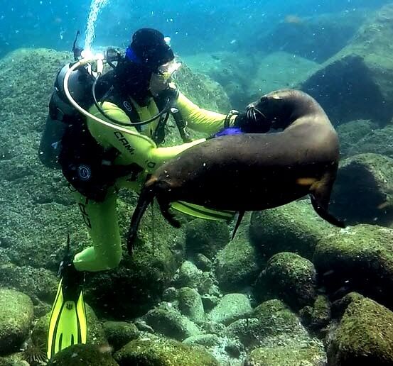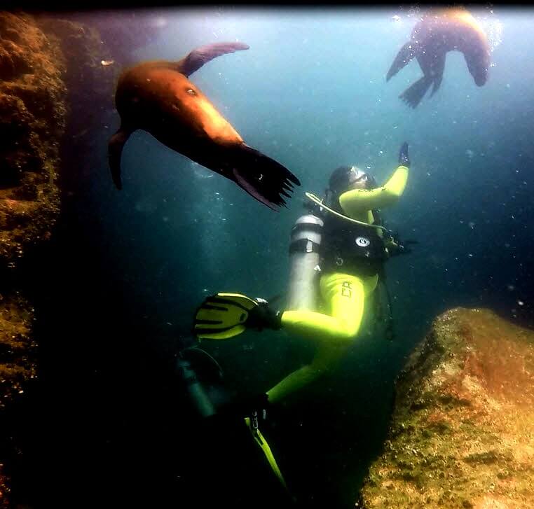 Auf ca. 15 m sehen wir schon die ersten jungen Seelöwen, die neugierig näher kommen und sofort mit unserem Guide (der übrigens selbst fast wie ein Seelöwe schwimmt und ein echt cooler Typ ist) spielen. Auf einmal zupft mich was am Ärmel und da war schon ein Seelöwe bei mir. Die sind so verspielt, es ist eine wahre Freude mit ihnen in Kontakt zu kommen und Action zu haben. Es gibt dort einen Arch, wo ziemlich viele Fische sind, und natürlich auch die Seelöwen Babies. Die großen wachen von oben über ihre Jungen.