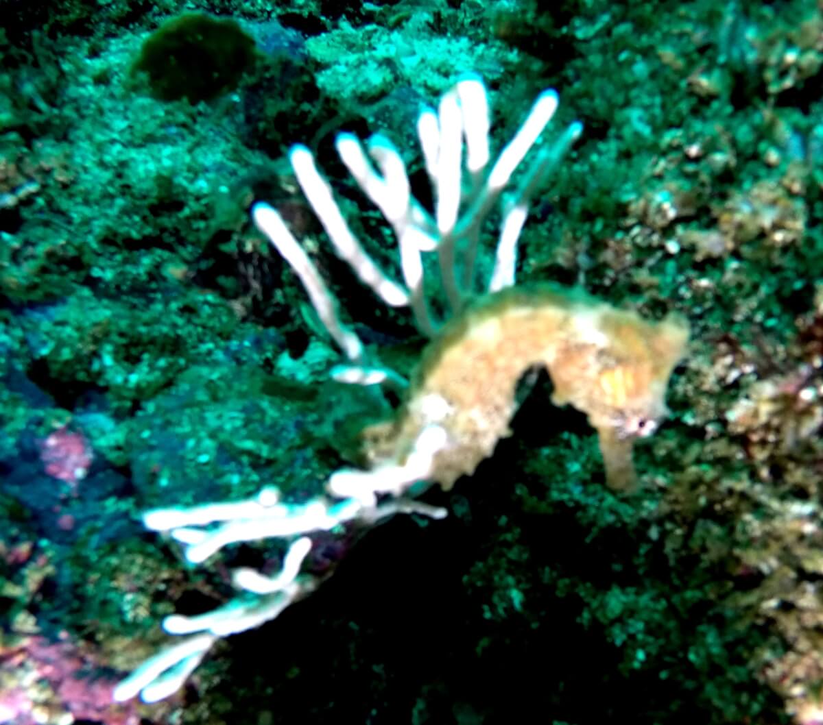 Noch immer Rotalgen! Seepferdchen, Igelfische, Fischschwarm. Sicht etwas besser!
