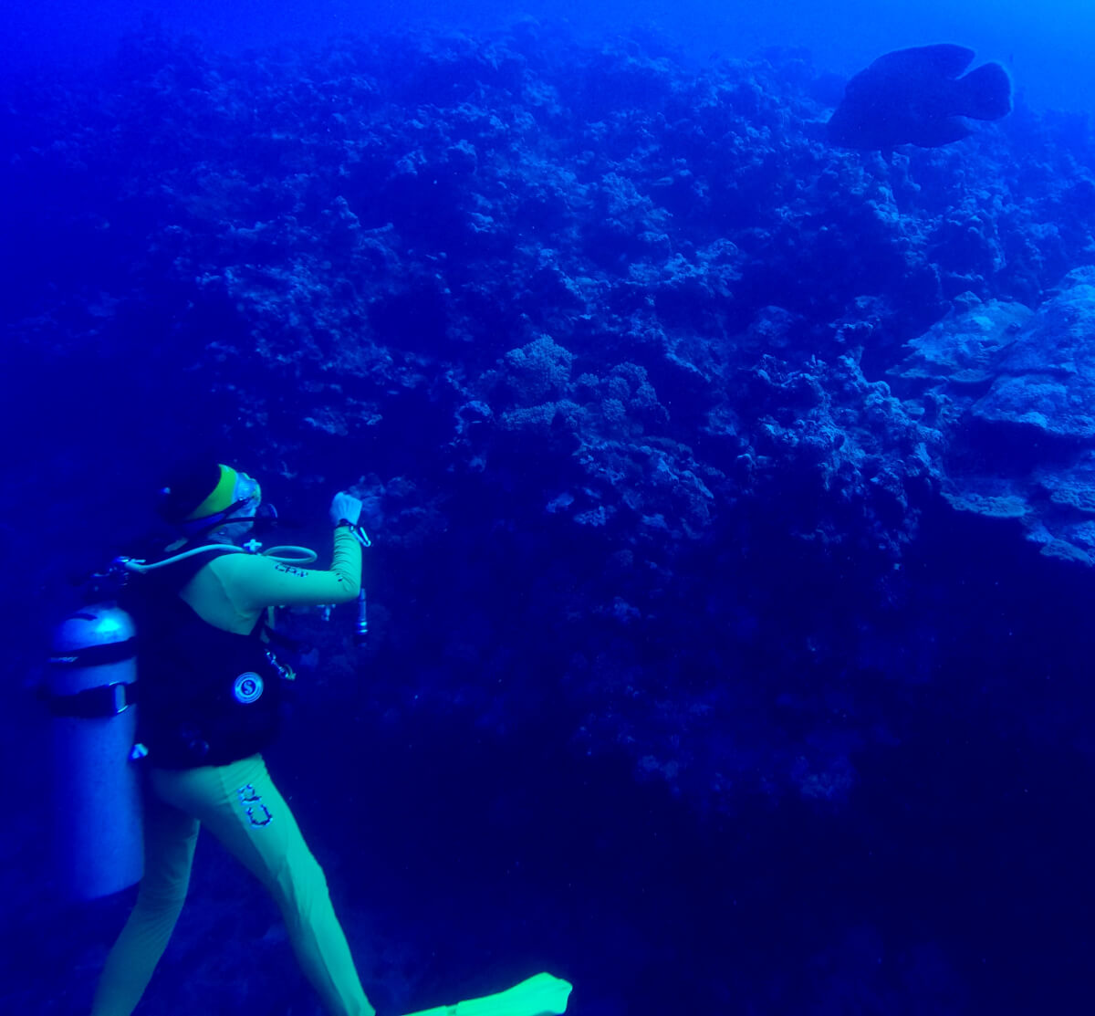 Ausbeute der 4 Tauchgänge waren eine grüne Schildkröte , ein Leaffish, Steinfish, Skorpionfish, Grouper, Lionfish, und ein Riesenschwarm von kleinen Fischen, die wie auf einer Autobahn alle in die selbe Richtung schwammen. Auch ein „Wrack“ war auf der Liste, es war allerdings schon ziemlich lädiert.